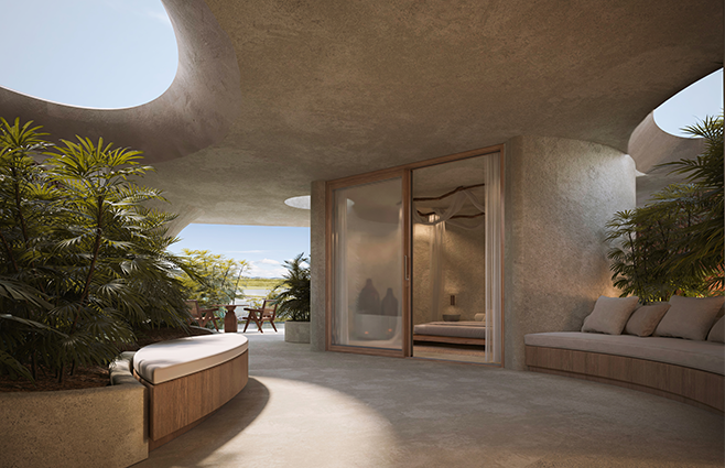 Arquitectura circular de doble anillo, tanto conceptual como funcional. Diseño sobrio y minimalista que invita a desconectar del exterior y reconectar contigo mismo.